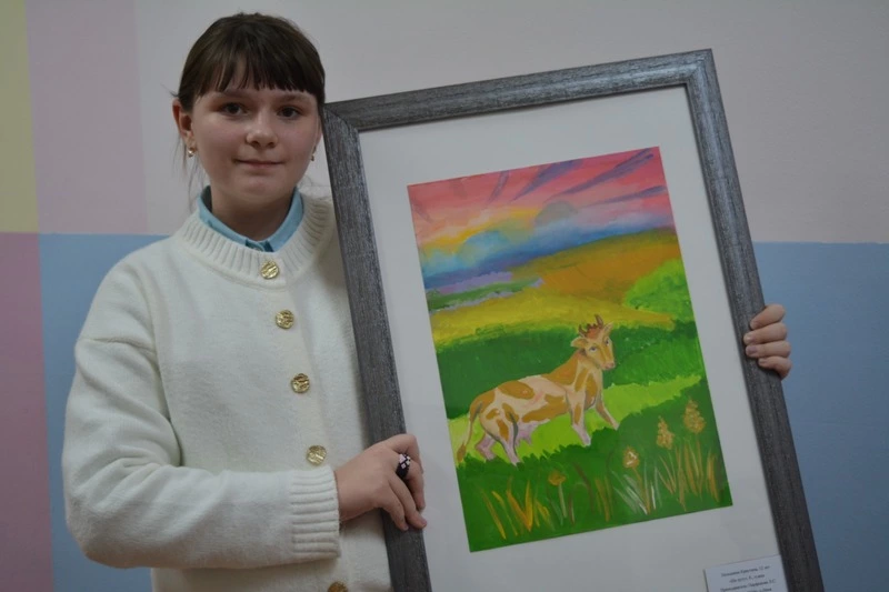 «Рисование — моё хобби. Хорошо рисовала с первого класса. Я выполнила свои работы в жанре пейзажа. Мне очень понравилось рисовать деревенский домик в графической технике. Это домик моей бабушки Веры Польшиной в Хомутцах. Писала по памяти», — рассказала Кристина Польшина. — «Работу «На лугу» с рыжей пасущейся на зелёном раздолье коровой я посвятила красоте родной природы, любимым сельским пейзажам, где я бываю. Эту рыжую красавицу увидела в Хомутцах, когда приезжала в гости к бабушке. Там уже мало осталось рогатых, но ещё есть. На творчество меня вдохновили работы Михаила Крамского «Страда», «В ночном».