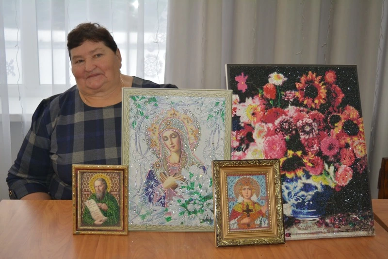 Вышитые бисером иконы, картины появились в жизни Екатерины Голевой случайно. Родственница привезла несколько икон для вышивки — наша героиня заинтересовалась и решила попробовать. Понравилось, затянуло. Потом ей привезли показать картину, вышитую бисером. И тут Екатерина Дмитриевна не устояла — решила научиться и научилась. В доме появились бисерные иконы. Именные иконы женщина создала и подарила своим детям.