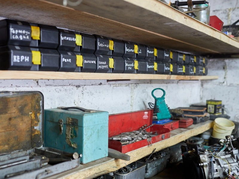 В гараже везде инструменты и запчасти.