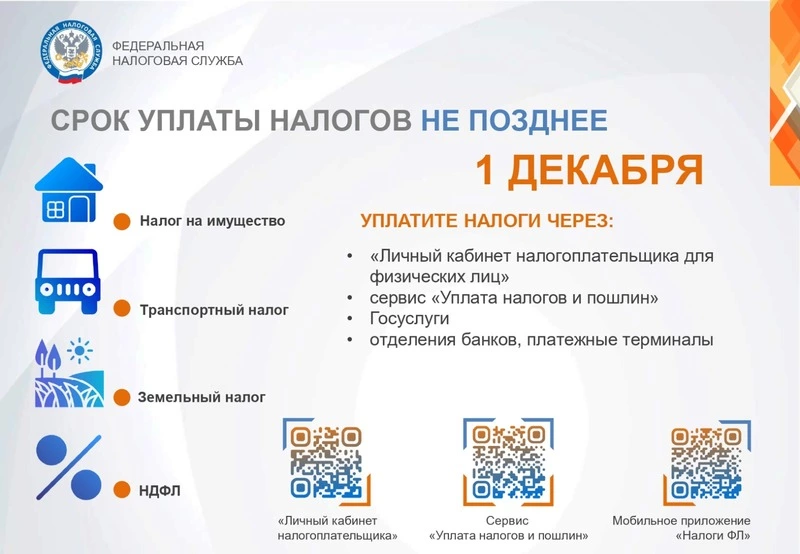 Управление Федеральной налоговой службы напоминает ивнянцам об оплате имущественных налогов. Сделать это необходимо не позднее 1 декабря 2025 года.