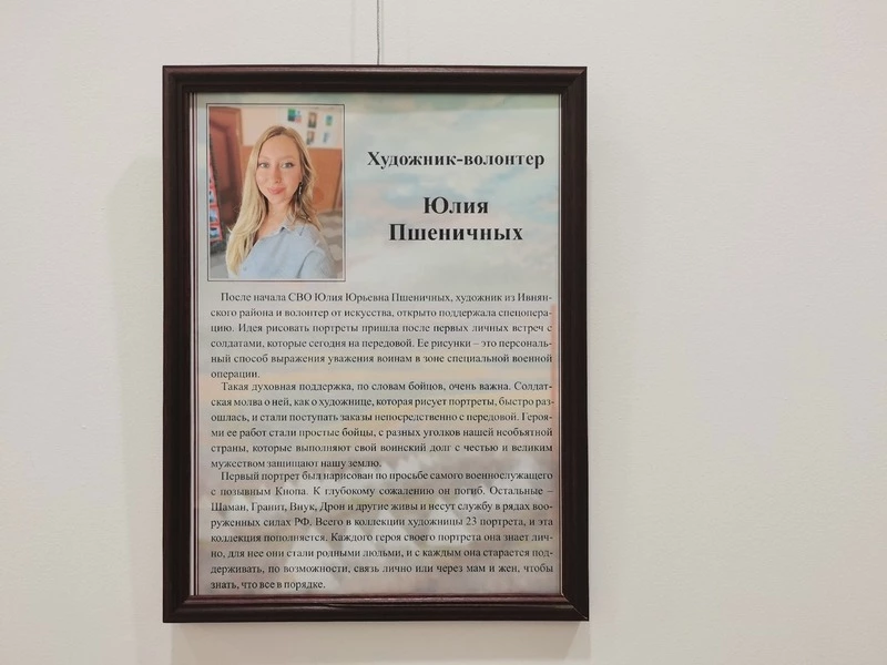 Героями творчества Юлии Пшеничных стали простые солдаты из разных уголков страны, которые с честью исполняют свой воинский долг. Всего в коллекции художницы 23 портрета, и она постоянно пополняется. Выставка будет работать до 31 января 2026 года.